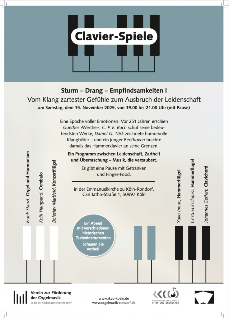 Auf allen Klaviaturen bespielt wird in diesem Jahr das Thema „Sturm – Drang – Empfindsamkeiten“, so auch am Samstag, 15. November 2025, ab 19:00 Uhr in der Emmanuelkirche Köln-Rondorf, Carl-Jatho-Str. 1. Bewährte Spielerinnen und Spieler traktieren die Tasten: Frank Stanzl, Harmonium und Orgel, Yuko Inoue und Christina Esclapez, Hammerflügel, Ketil Haugsand, Cembalo, Johannes Geffert, Clavichord, und Hauspianist Boleslav Martfeld, Konzertflügel.