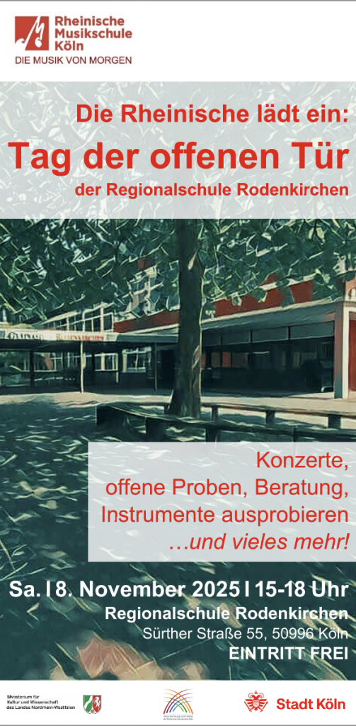 Die Regionalschule Rodenkirchen der Rheinischen Musikschule Köln lädt am Samstag, den 8. November 2025, von 15:00Uhr bis 18:00Uhr am Gymnasium Rodenkirchen, Sürther Straße 55, zum Tag der offenen Tür ein. Sie können ein buntes Musikprogramm von und für jung und alt erleben, sowie selber die verschiedenen Musikinstrumente ausprobieren. Wir freuen uns über Ihren Besuch!