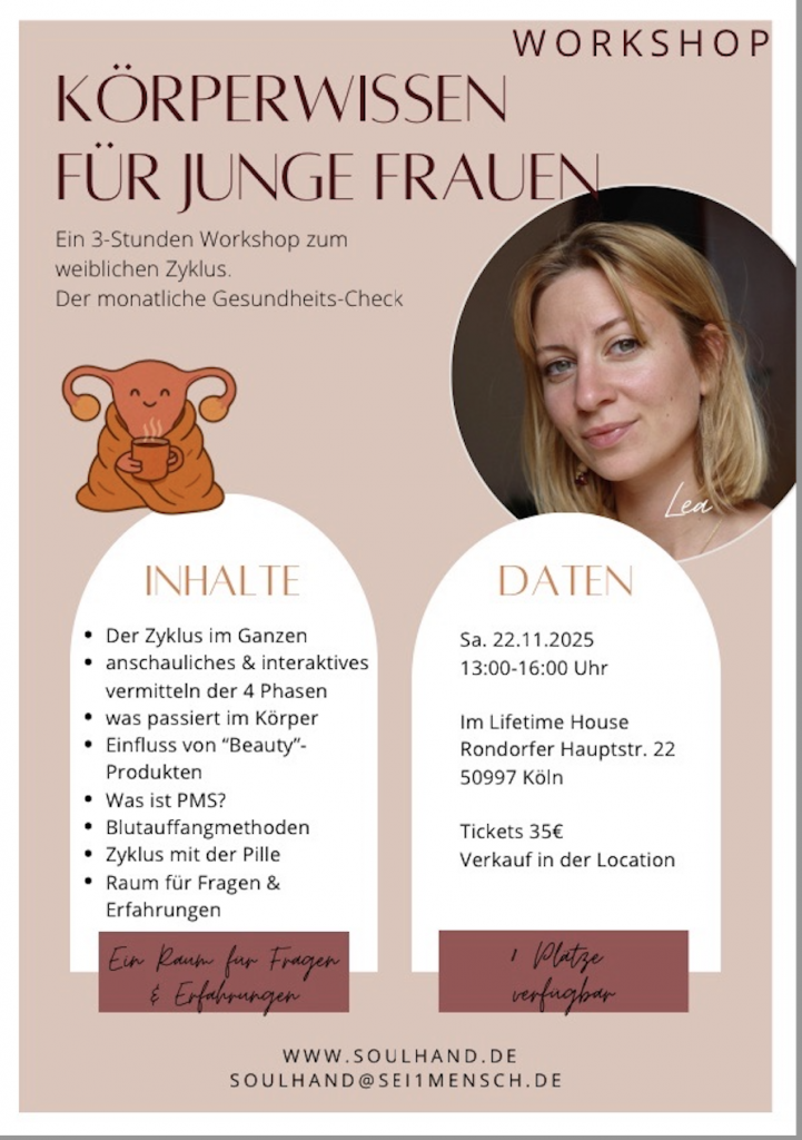 In drei Stunden vermittle ich anschaulich und interaktiv alle Phasen des weiblichen Zyklus, sowie weitere zusammenhängende Themen.
