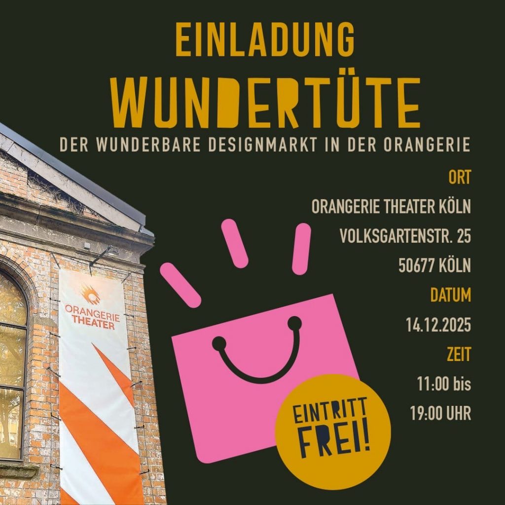 Am 14.12.25 findet im Kölner Orangerie Theater in der Südstadt wieder die Ausstellung der Wundertüte statt. In Foyer und neuem, vergrößertem Theatersaal zeigen 17 Aussteller:innen ihre handgefertigten Unikate: Mode, Schmuck, Textiles, Keramik, Lederaccessoires, Holzobjekte, Malerei und kulinarische Highlights.Dieser Eintrag wird Ihnen zur Verfügung gestellt vom Kölner BilderBogen - eines der beliebtesten Stadtmagazine in Köln. Ihr […]
