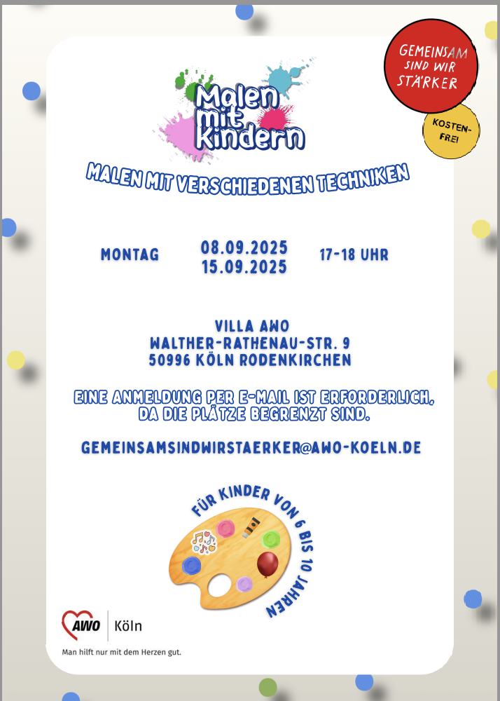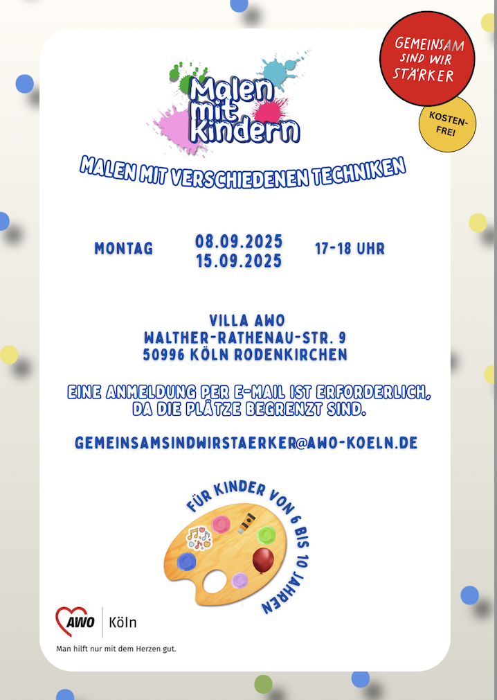 Malen mit verschiedenen Techniken für Kinder von 6 bis 10 Jahren. Anmeldung erforderlich.Dieser Eintrag wird Ihnen zur Verfügung gestellt vom Kölner BilderBogen - eines der beliebtesten Stadtmagazine in Köln. Ihr Termin fehlt? Einfach kostenlos einreichen: www.bilderbogen.de/eventeintrag