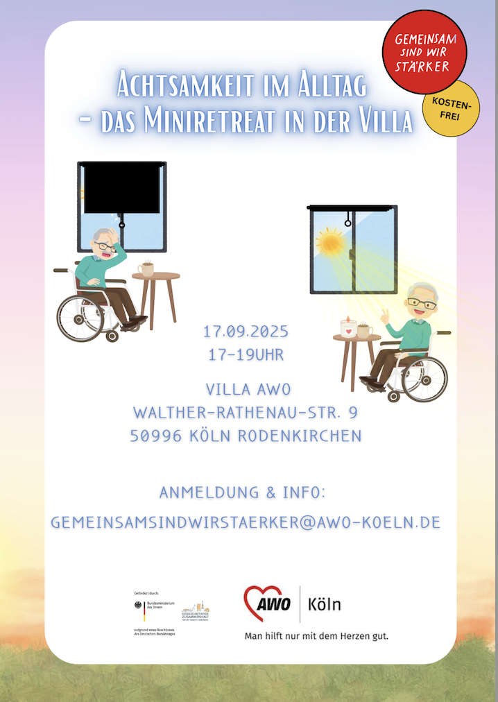 Das Team der Villa AWO lädt Sie herzlich zu einer kleinen Achtsamkeitsübung ein.Dieser Eintrag wird Ihnen zur Verfügung gestellt vom Kölner BilderBogen - eines der beliebtesten Stadtmagazine in Köln. Ihr Termin fehlt? Einfach kostenlos einreichen: www.bilderbogen.de/eventeintrag