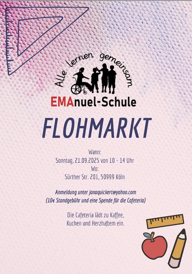 Die EMAnuel-Schule lädt am 21.9. ab 10:00 zum Flohmarkt ein. Es können gut erhaltene Kleidung, Bücher und Spielsachen gekauft und verkauft werden. Die Cafeteria lädt zu Kaffee und Kuchen ein.Dieser Eintrag wird Ihnen zur Verfügung gestellt vom Kölner BilderBogen - eines der beliebtesten Stadtmagazine in Köln. Ihr Termin fehlt? Einfach kostenlos einreichen: www.bilderbogen.de/eventeintrag