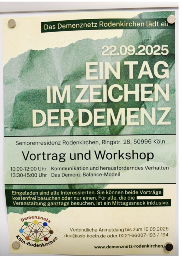 Vortrag und Workshop 10-12 Uhr Kommunikation und herausforderndes Verhalten 13.30-15 Uhr Das Demenz-Balance-Modell Eingeladen sind alle Interessierten. Sie können beide Vorträge besuchen oder nur einen. Ein Mittagssnack für alle, die die Veranstaltung ganztägig besuchen, ist inklusive. Verbindliche Anmeldung bis zum 10.09.2025 duo@asb-koeln.de oder 0221-66007-193/194Dieser Eintrag wird Ihnen zur Verfügung gestellt vom […]