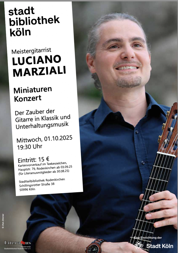 Wir freuen uns auf Luciano Marziali, einen Zauberer an der Gitarre, der sein Publikum mit einer gekonnten Mischung aus anspruchsvollen, klassischen Stücken und unterhaltsamer Musik, begeistert. Anhand der kleinsten Kompositionsform, der Miniatur, präsentiert der gebürtige Italiener in der Stadtteilbibliothek Rodenkirchen diverse Werke bekannter, meist italienischer Komponisten und kombiniert sie mit Ausflügen in die klassische Literatur, kurzen packenden Geschichten und […]