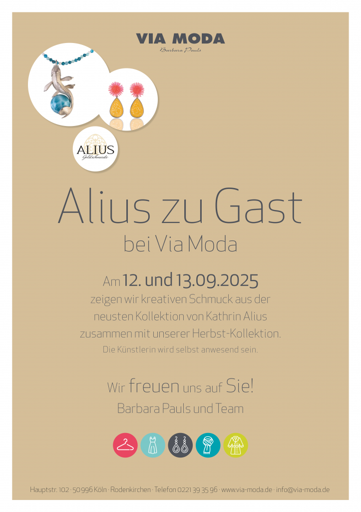 Am 12. und 13.09.2025 zeigen wir kreativen Schmuck aus der neusten Kollektion von Kathrin Alius zusammen mit unserer Herbst-Kollektion. Die Künstlerin wird selbst anwesend sein. Dieser Eintrag wird Ihnen zur Verfügung gestellt vom Kölner BilderBogen - eines der beliebtesten Stadtmagazine in Köln. Ihr Termin fehlt? Einfach kostenlos einreichen: www.bilderbogen.de/eventeintrag