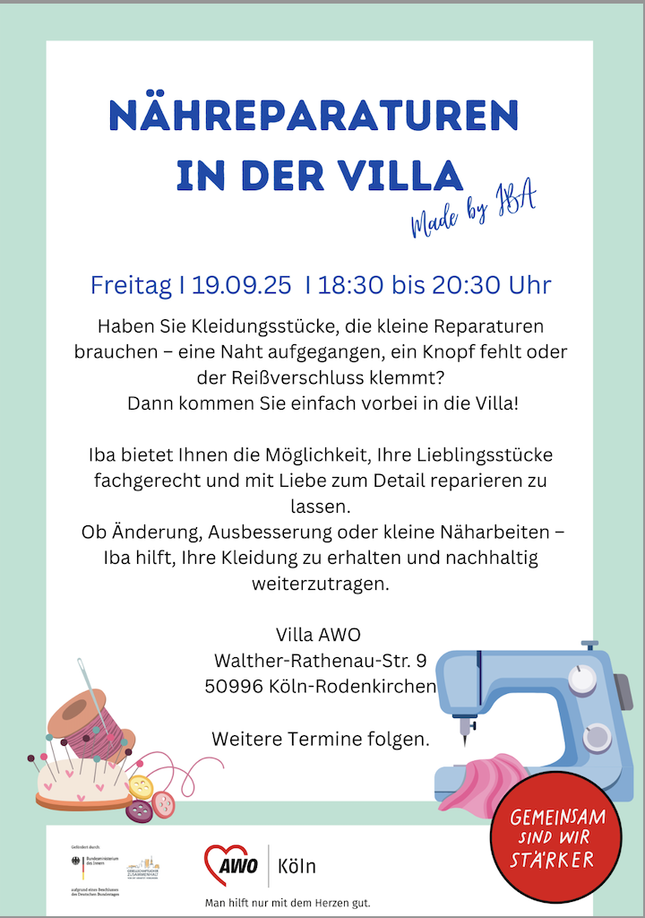 Lieblingsstücke retten statt wegwerfen! Ab sofort können Sie in der Villa Ihre Kleidung zur Reparatur bringen – ob Knopf annähen, Reißverschluss richten oder kleine Änderungen. Nachhaltig, praktisch und mit Liebe zum Detail. Start 19.09.2025 um18:30 Uhr. Weitere Termine folgen. Kommen Sie vorbei und geben Sie Ihren Textilien ein zweites Leben! Spenden fürs Material sind herzlich […]