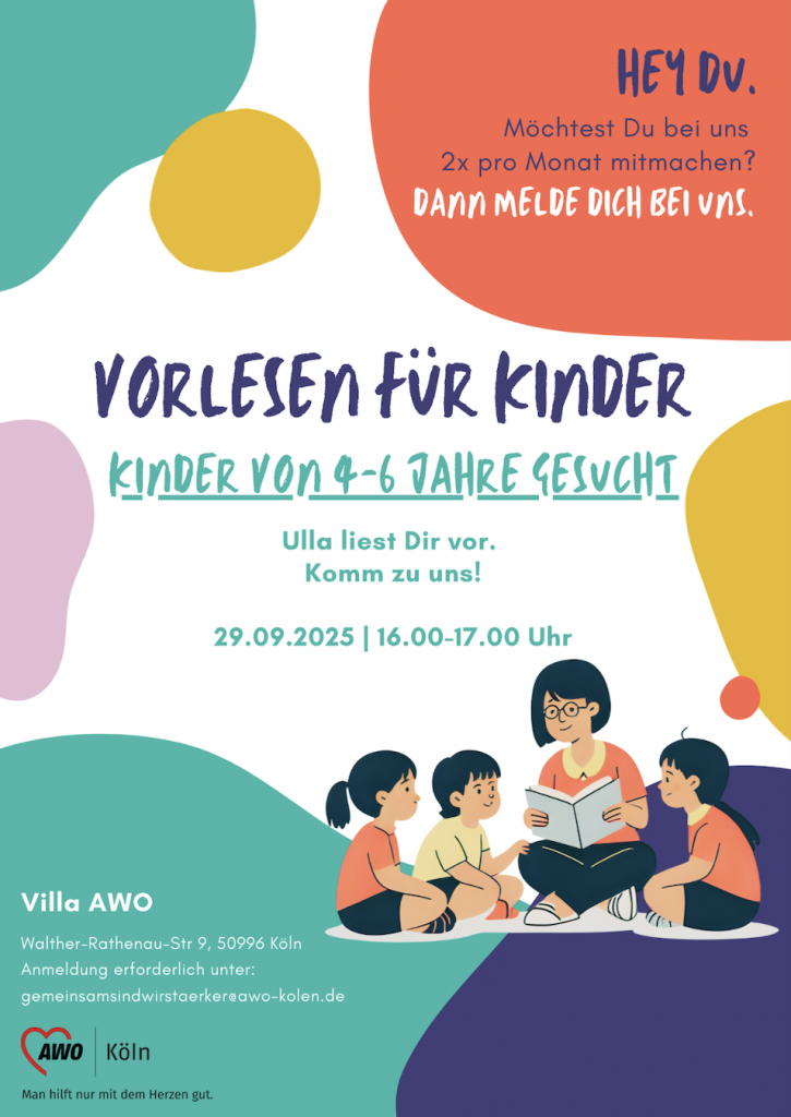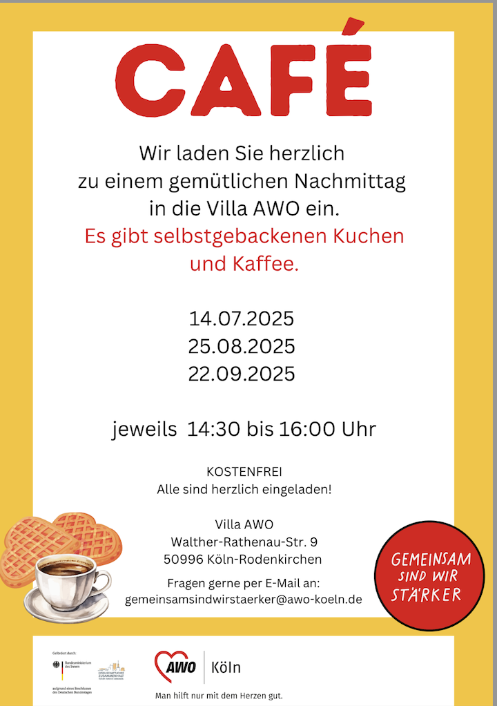Wir laden Sie herzlich zu einem gemütlichen Nachmittag in die Villa AWO ein. Es gibt selbstgebackenen Kuchen und Kaffee. Wir freuen uns über Spenden.Dieser Eintrag wird Ihnen zur Verfügung gestellt vom Kölner BilderBogen - eines der beliebtesten Stadtmagazine in Köln. Ihr Termin fehlt? Einfach kostenlos einreichen: www.bilderbogen.de/eventeintrag