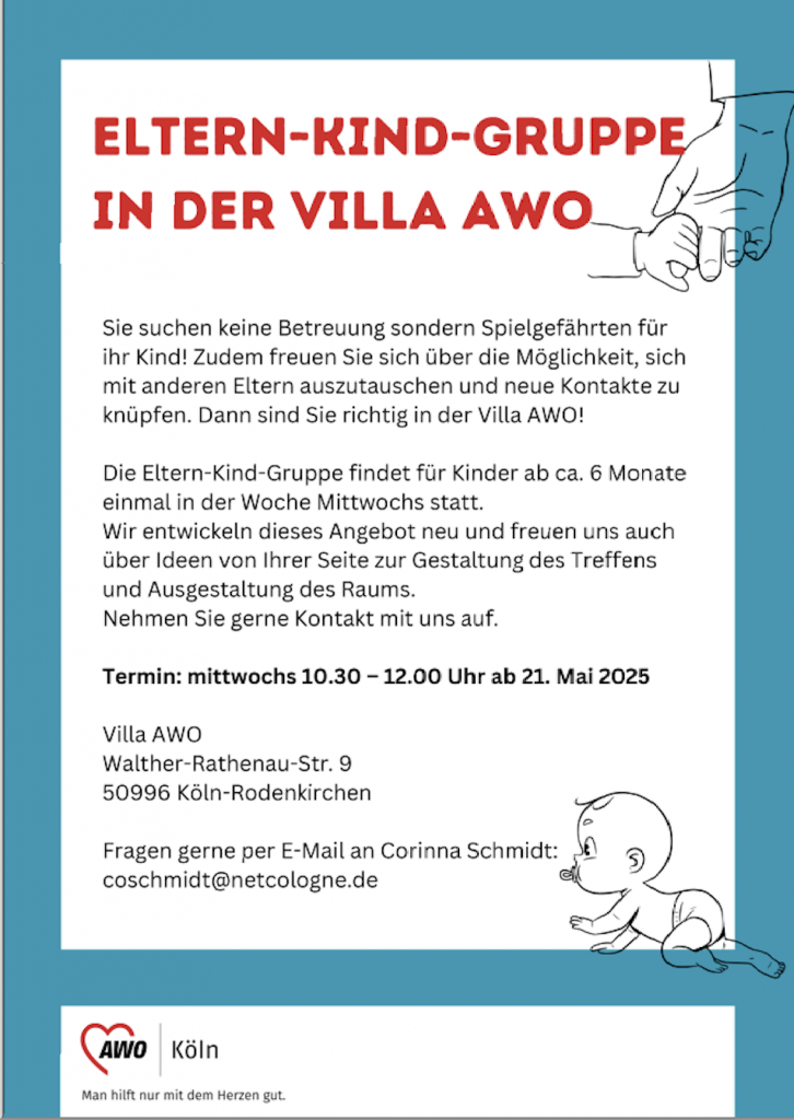 Die Eltern-Kind-Gruppe findet wöchentlich immer am Mittwoch statt und sie kostenfrei.Dieser Eintrag wird Ihnen zur Verfügung gestellt vom Kölner BilderBogen - eines der beliebtesten Stadtmagazine in Köln. Ihr Termin fehlt? Einfach kostenlos einreichen: www.bilderbogen.de/eventeintrag
